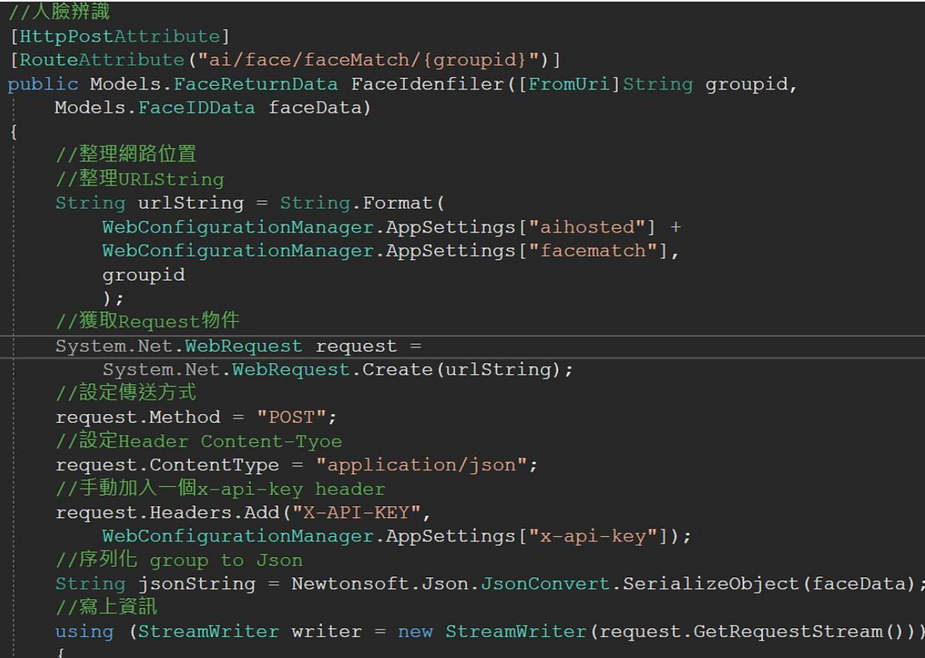至於程式碼,您可以使用 Java 或者 C#或者您熟悉的任何程式語言均可,因為採用 Open API 架構撰寫,非關程式語言的侷促性。如圖四,為筆者撰寫一個 REST Service 進行前端系統上傳相片資料,並解 送至雲端 AI 服務進行人臉辨識的原生碼。