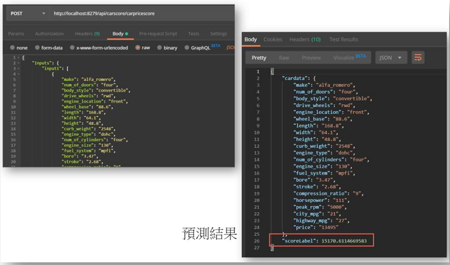 完成中介服務設計之後,採用 Postman 工具進行單元測試,測試自訂服務整合佈署完成的 AI Service,進行汽車架構預估推測運行。
