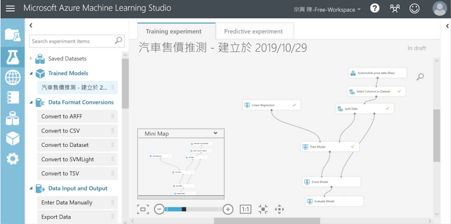 換句話說,如果您已經準備或者收集好訓練與測試資料,您需要短時間內完成實驗,建置服務與前端人機系統開發整合。這時候您即可借力使力,使用如Google AutoML 或者是Azure Machine Learning。可以透過視覺化工具,採用視覺化拖曳建立起您的機器學習,並且餵上訓練資料與測試資料,之後包裝成一個Web Service。