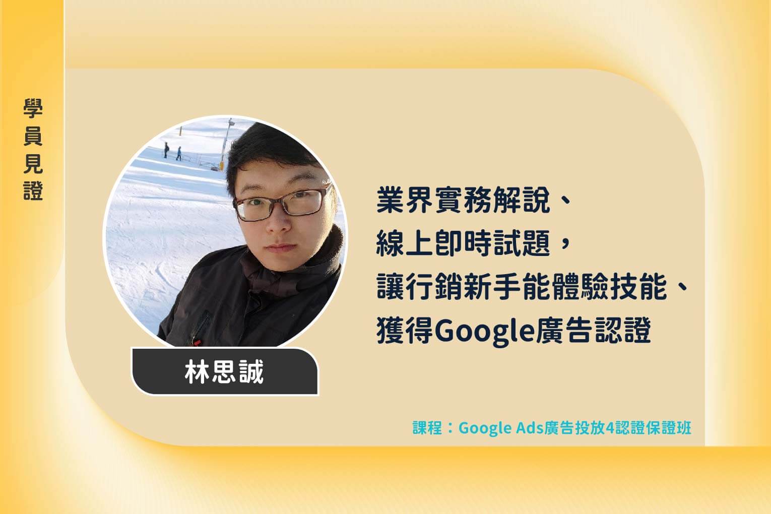 第一次參加緯育的線上課程,自己是個行銷新手,十分推薦老師的 Google Ads廣告投放4認證保證班 課程,我是為了學習新技能而來,內容相當的豐富且對於證照題型講解很仔細。 透過老師很有耐心且清楚的教學,以及老師實際的後台操作介紹,讓我學到不少,也順利獲得認證,就算是新手來體驗新技能,也非常棒!