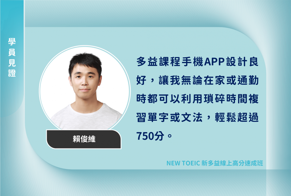 我覺得線上教學的方式,要維持學生的學習動機非常不容易,我認為 NEW TOEIC 新多益線上高分速成班 每部影片都切在 10 分鐘內非常適合,能夠在通勤或休息時觀看一個小重點,並且增加學習意願。每個章節後的複習測驗,也能讓我更快速回顧相關概念,十分受用,真心推薦給希望利用碎片時間學習的上班族。