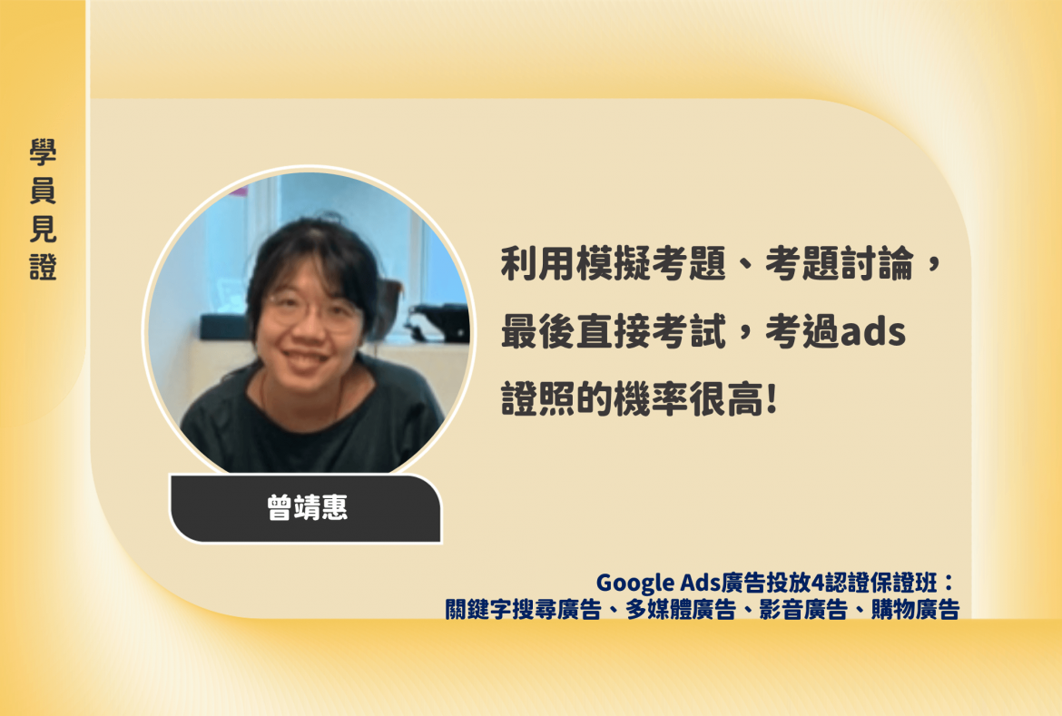 因為現在google的演算法變化很快,希望 Google Ads 廣告投放4認證保證班課程可以更新得更快一點~不過整體而言這次上課,講師教學輕鬆之中卻很實用,考試也好、觀念上的重點都抓得很好。課後也願意撥時間回答問題,很親切很負責,也會分享實務的運用,算是很接地氣!