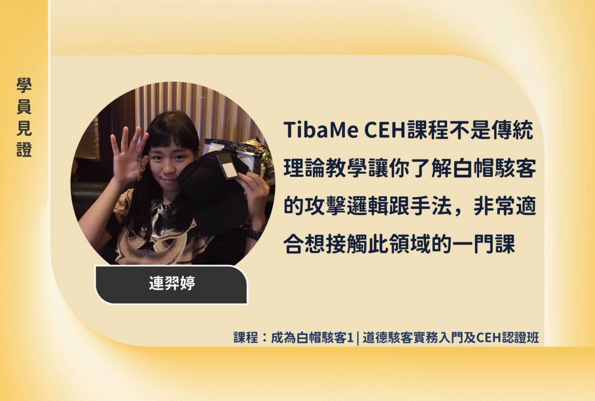 TibaMe CEH課程不是傳統理論教學,上課也都會搭配LAB模擬CTF的實作,讓課程不會枯燥乏味,後續自修時有任何不懂或忘記的也能搭配錄影紀錄來複習,此課程能讓你了解白帽駭客的攻擊邏輯跟手法,非常適合想踏入此領域的一門課。