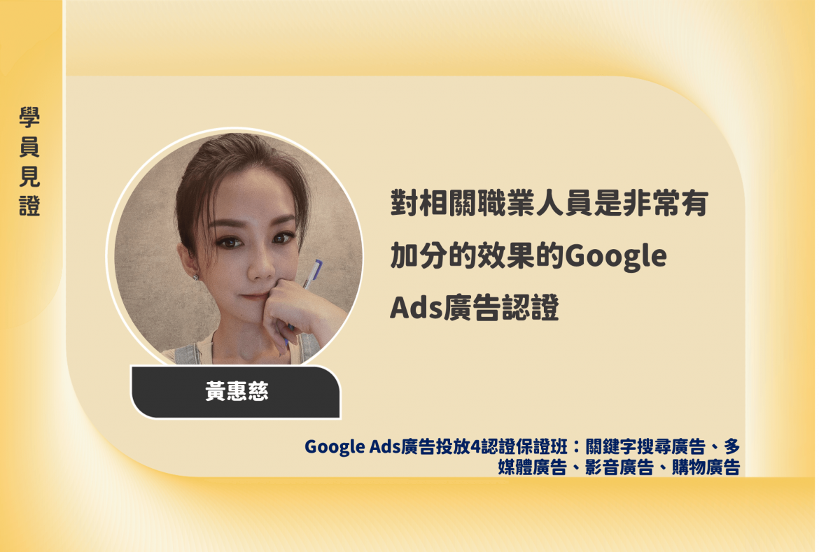 了解更多:Google Ads廣告投放4認證保證班:關鍵字搜尋廣告、多媒體廣告、影音廣告、購物廣告