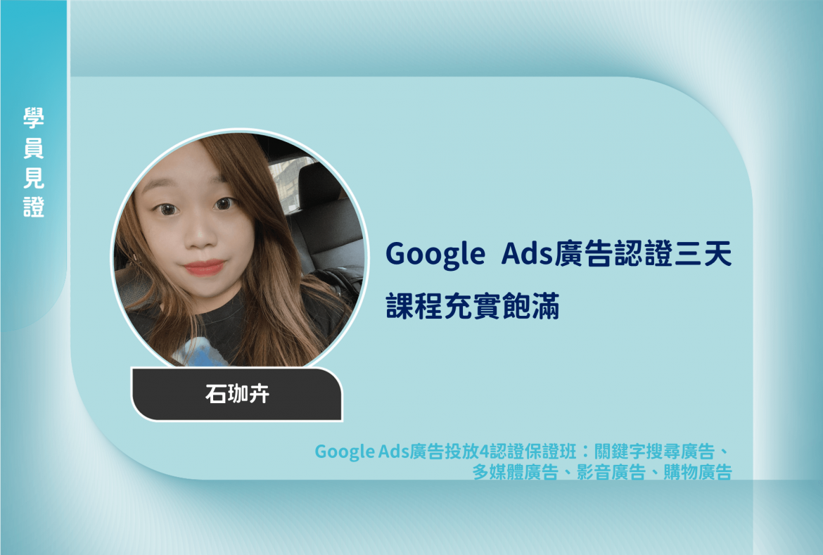 了解更多:Google Ads廣告投放4認證保證班:關鍵字搜尋廣告、多媒體廣告、影音廣告、購物廣告
