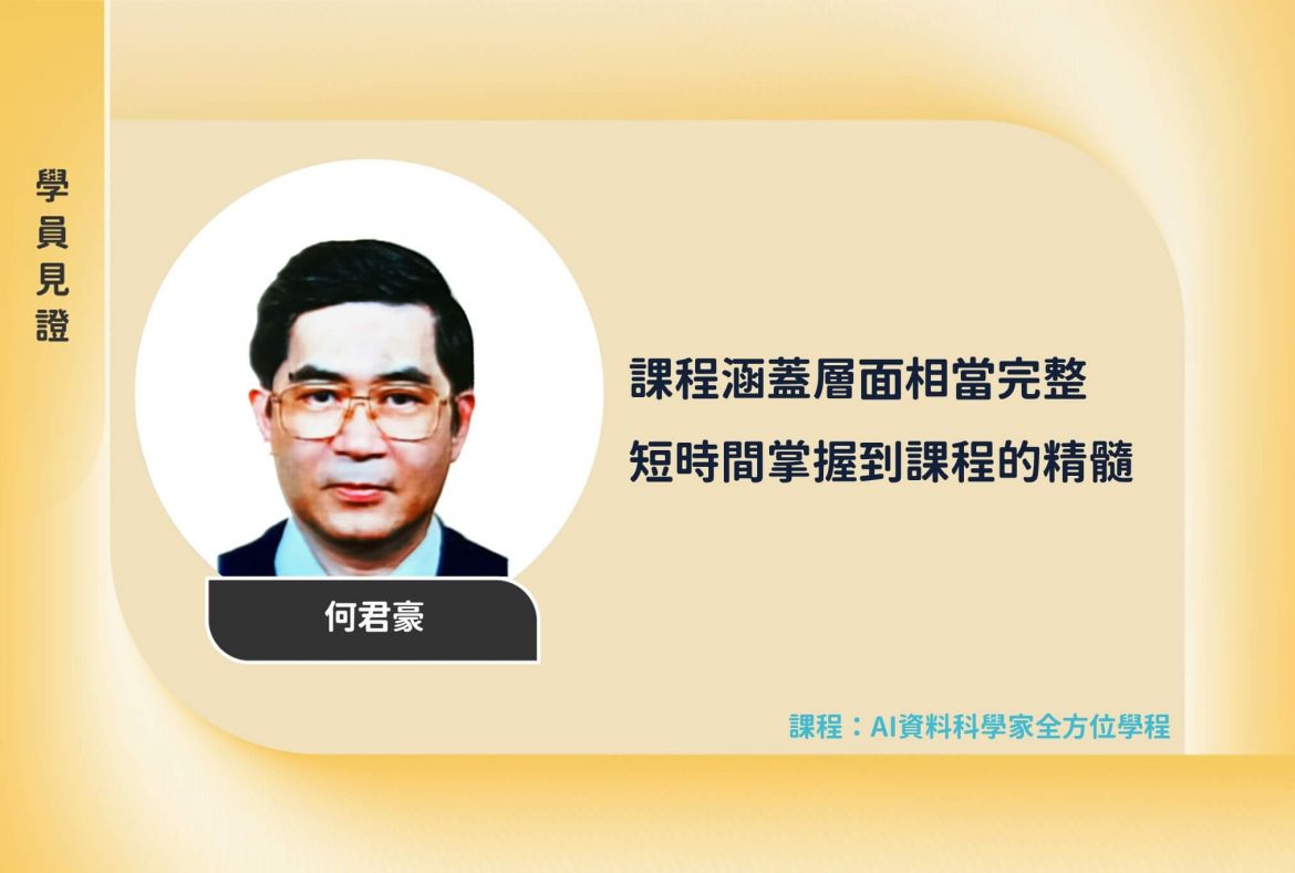 AI資料科學家的課程涵蓋層面相當完整,從基礎的Pythont入門、MySQL資料庫等課程,進階的爬蟲、機器學習、文字探勘,到高階的深度學習與視覺影像課程全部都有深入淺出的介紹。而講師無論是線上錄影或直播課程都能夠提網契領,讓學員在短時間內能掌握到課程的精髓,使學員獲得自學過程中難以理解的觀念。講義中程式實作部分,更可使學員對整體課程全面融會貫通。