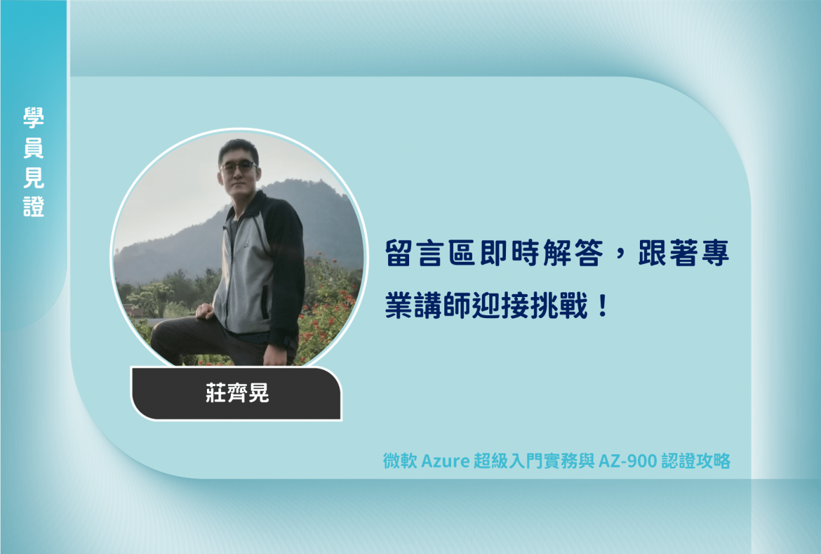 在這次微軟 Azure 超級入門實務與 AZ-900 認證攻略學習體驗中,我深深感受到講師的專業與用心。講師清晰的口齒、適中的教學節奏,搭配DEMO資料和截圖畫面的呈現,讓複雜的概念也能變得生動易懂。講師不僅提供基本內容,更進一步延伸補充,讓我對課程的理解更加深入。