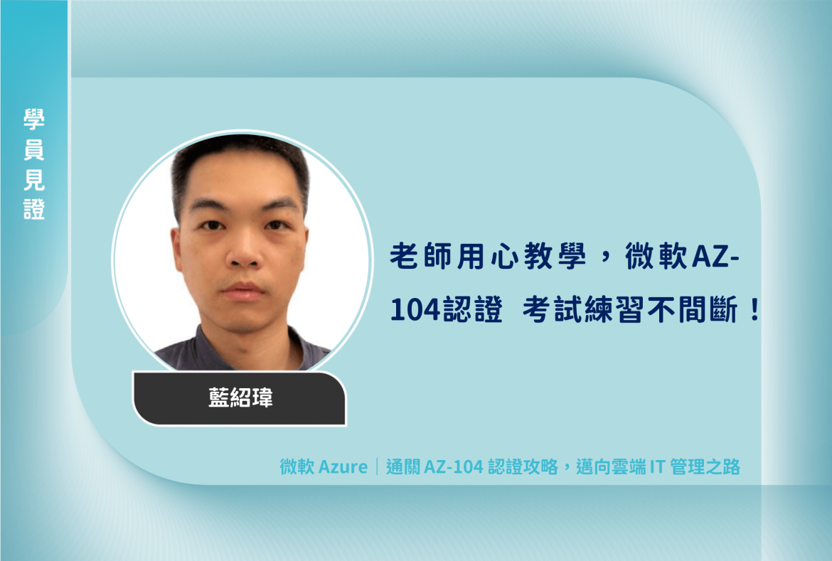 老師不僅是一位知識豐富的專家,更是一位用心教學的良師。他準備的微軟AZ-104認證 邁向雲端 IT 管理之路課程內容細緻而充實,並在每節課結尾設計了多種練習,培養了我獨立思考和解決問題的能力。通過這個課程,我不僅提升了在職場上的技能水平,更打開了通往雲端 IT 管理之路的大門。