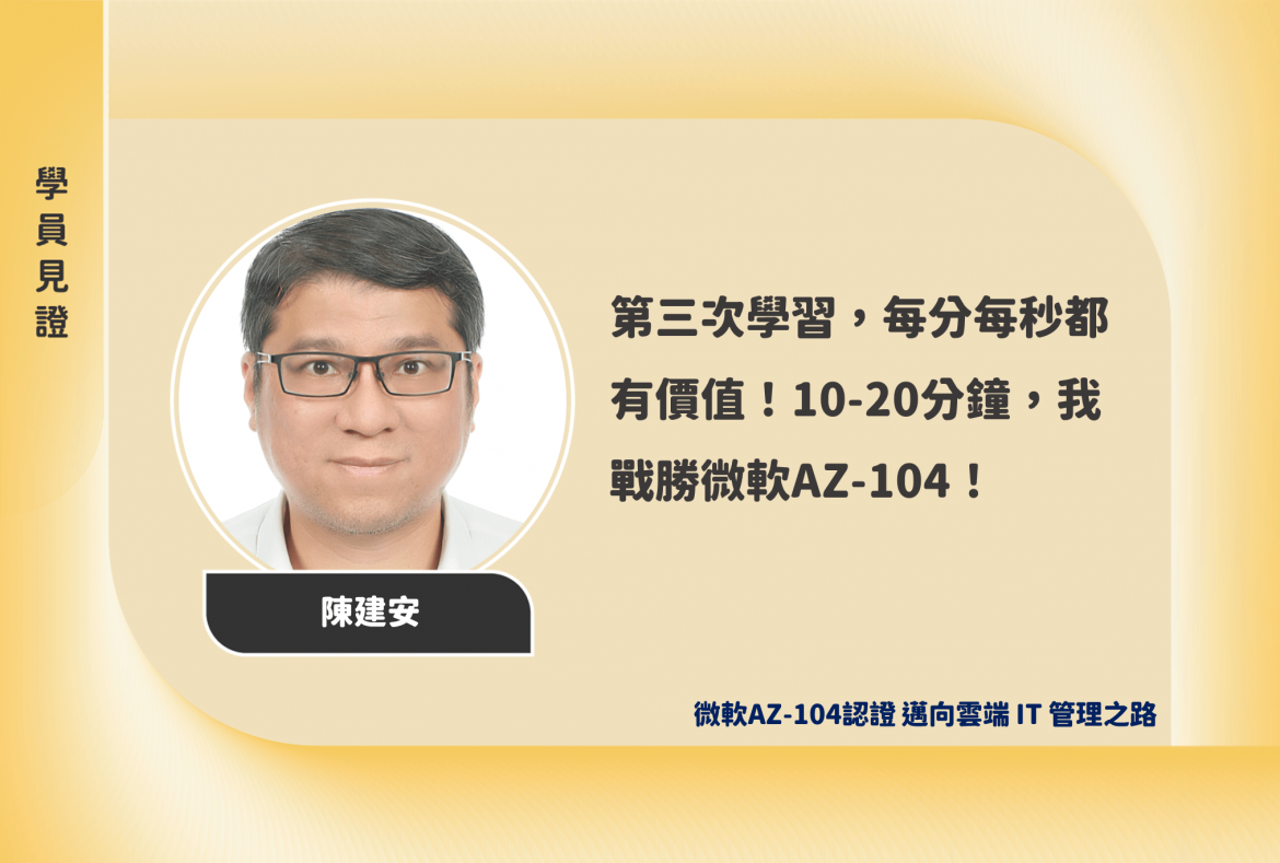 我花了大約一個月的時間跟隨Alan老師的課程,再花了一個月自學微軟Learn,終於成功通過了AZ-104考試。在此,我要特別感謝Alan老師,沒有他的細心教導,我可能難以理解微軟Learn中的知識。同時,我也要感謝TibaMe提供了如此完善的線上學習平台。身為一個上班族,我能夠隨時隨地挪出10至20分鐘來學習,這種無壓力的學習環境,讓我在短時間內就完成了微軟AZ-104認證 邁向雲端 IT 管理之路的學習,並且順利拿到了認證。這段學習之旅不僅讓我技能得到提升,更讓我深刻體會到持續學習的重要性,期待著在未來的工作中能夠更好地應用所學,開創更美好的事業前景。