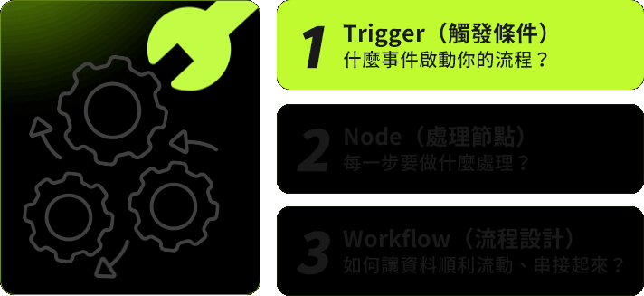 觸發器 Trigger | 啟動流程的「開關」 | 每天早上 9 點、表單送出後 |