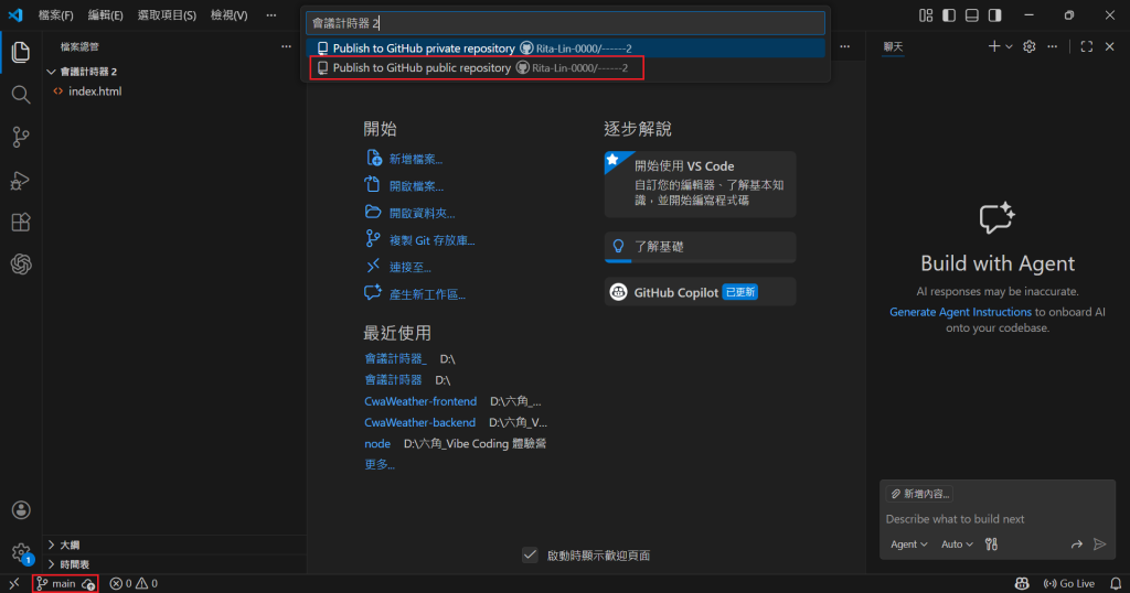 3 ) 點擊左下角有個上傳雲端的符號,接著點選 Publish to Github public / private repository,就可以將程式存放到 Github 了。