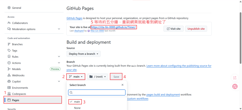 4 ) 回到 Github,找到剛剛上傳的專案,點擊右上方 Settings,再跟著圖片步驟就能的得到一組公開網址了。