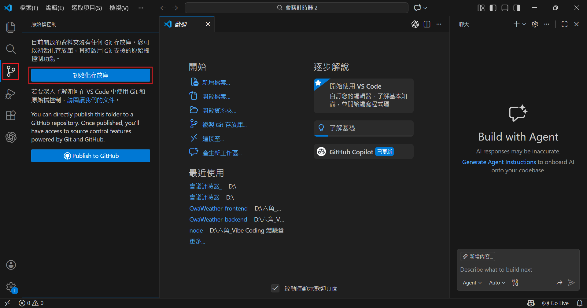 點擊下方圖片的按鈕,就可以開啟 Git 版本控制。不過首次使用的話,會顯示 “下載適用於 Windows 的 Git”,只需點擊再跟著其步驟安裝即可。