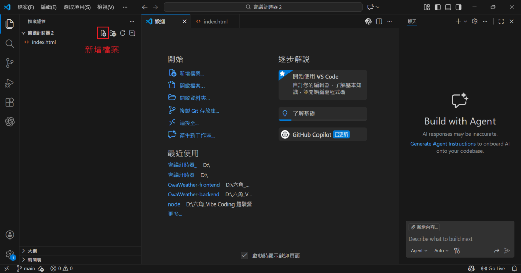 根據不同的 Vibe Coding 專案,AI 生成的程式碼可能會需要存放成好幾個檔案,所以事先建立一個專屬資料夾,會更方便檔案的存取。接著開啟 VS Code,點選剛剛建立好的資料夾,就可以新增檔案了,接著只要將下一步所產出的程式碼複製貼上,就可以進行測試了。